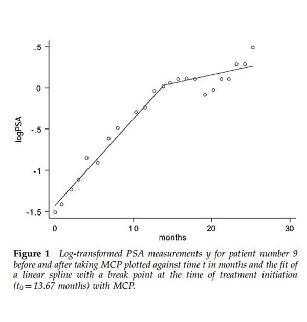 All men in the study were experiencing serial increases in PSA after localized treatment, that is, radical prostatectomy, radiation, or cryosurgery. The objective of the study was to determine the effectiveness of MCP at increasing the prostate-specific antigen doubling time(PSADT).