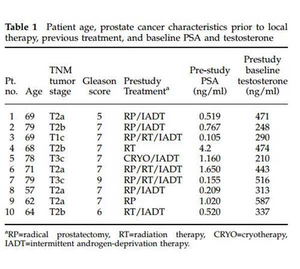 Patients selected for this study had biopsy-confirmed adenocarcinoma of the prostate, were untreated at the time of entry into the study, and had low but progressively rising PSA levels (o10 ng/ml). All the patients included in the study had biochemical PSA failure following an attempt at local curative therapy(eg radical prostatectomy, external beam radiation, or cryosurgery), and eight of the patients had previously been treated with androgen-deprivation therapy (ADT).Patients had at least three rising PSA levels documentedprestudy over not less than a 6-month interval. Patientswho had received prior ADT must have had a stable or steady-state serum testosterone level of Z150 ng/mlfor at least 6 months prior to being included in the study.
