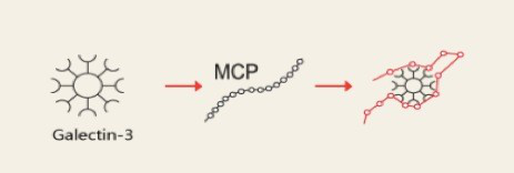 MCP can compete with Galectin-3 (tumor associated protein, in relation of tumor growth and metastasis). The following picture demonstrates MCP's chelation function towards galectin-3. MCP molecule is in linear long-chain structure. After be absorbed into the blood, it can quickly bind to galectin-3, then wrap outside of the cell to prevent tumor cell nutrient uptake, and inhibit both aggregation of tumor cells and adhesion to normal cells, thus prevent the growth and metastasis of tumor cells.