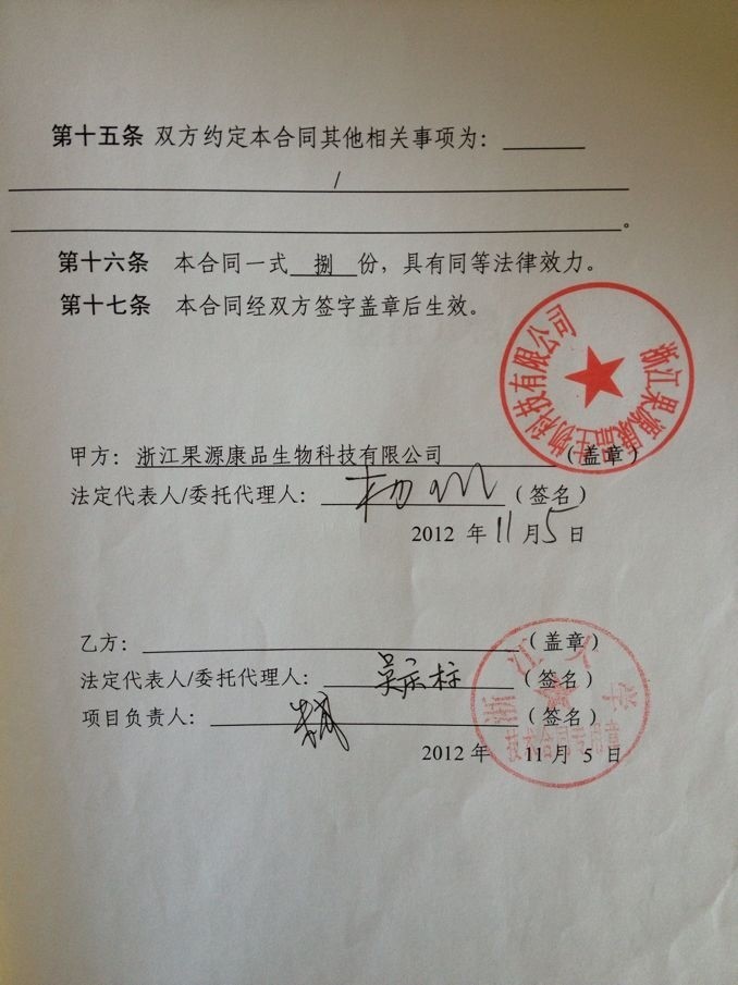 2012年11月,浙江果源康品生物科技有限公司与浙江大学药物研究所签订技术开发委托合同,就改性柑橘果胶的排铅和解酒功能进行了合作研究工作和功能试验。试验对低分子柑橘果胶不同分子量和酯化度对解酒和排铅效果的影响做了分析研究, 并根据试验结果确定了相应产品配方。