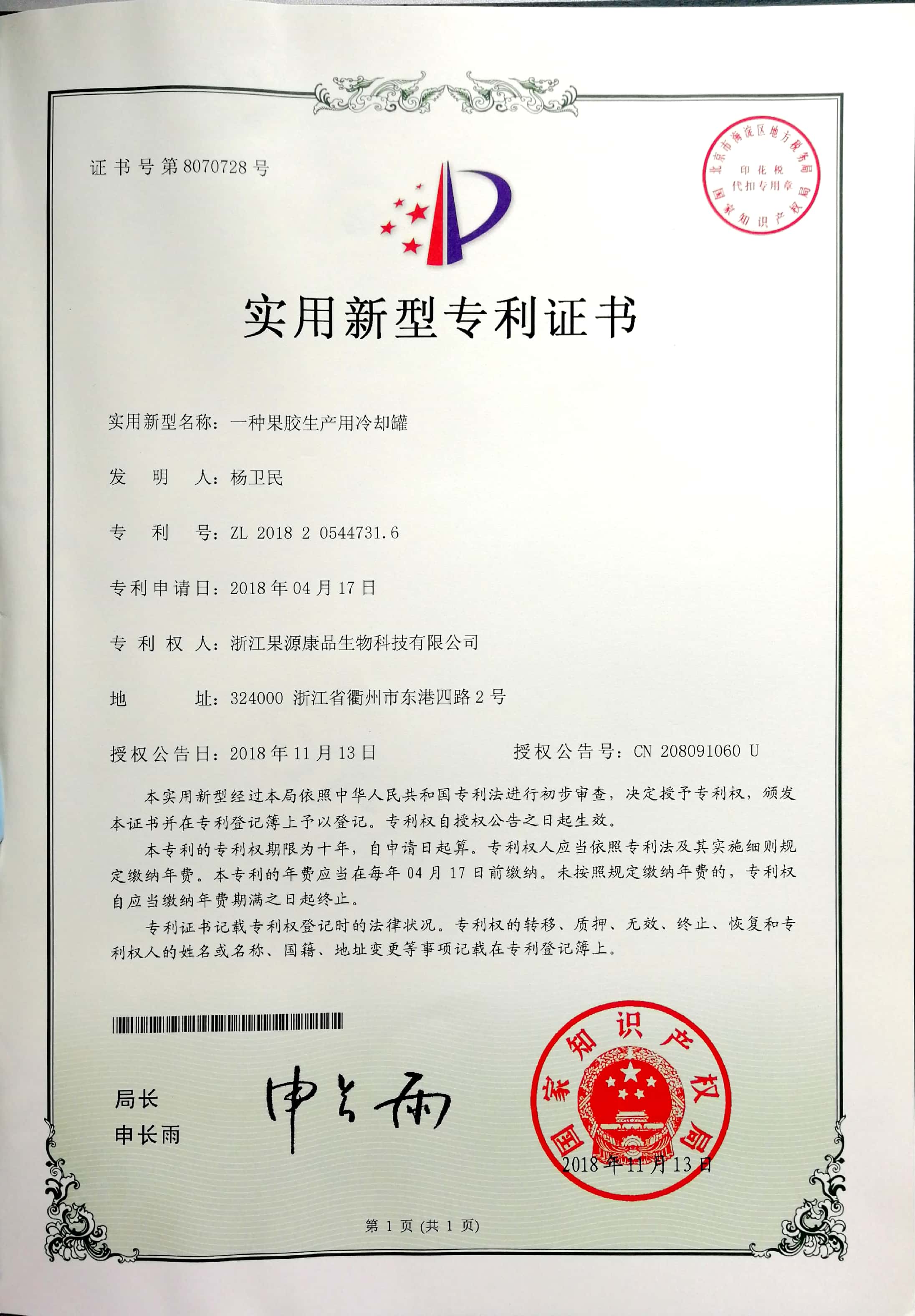 3. 实用新型名称:一种果胶生产用冷却罐 专利号:ZL 2018 2 0544731.6