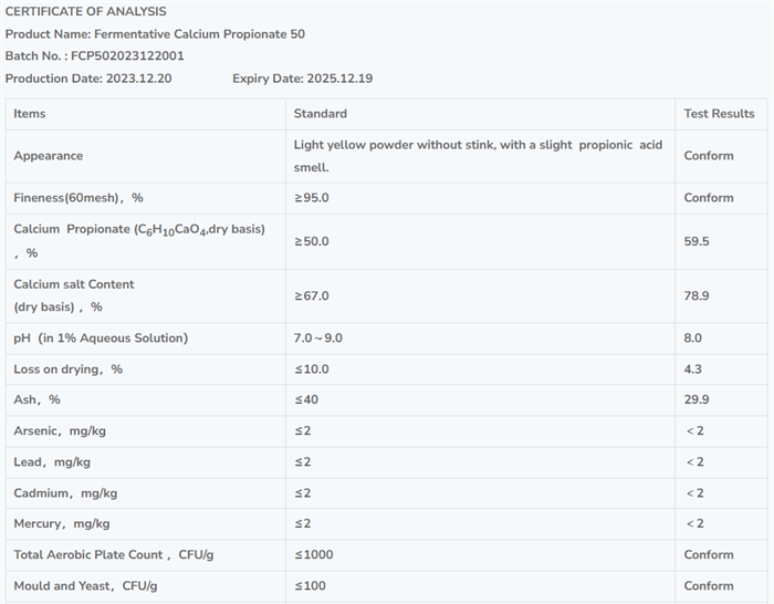 Calcium propionate is a safe and reliable fungicide for food and feed. The free propionic acid produced by calcium propionate under acidic conditions has broad antibacterial effects on bacteria, mold, yeast and so on